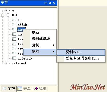 第三步,点击“确定”来保存。我们在设计器的“字符”列表中可以看到它了,现在我们右键选中它,选择“辅助”-“复制Echo”,如下图: