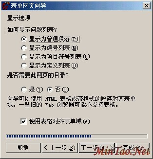 单击"下一步"按钮后,会出现关于个人信息的对应项目,对各项内容做好选择后,单击"下一步"按钮。 这样,问题就添加到列表中,如果不想在添加问题,直接单击"下一步"按钮继续制作。 在"如何显示问题列表"下有4个单选钮,是用来调整问题的显示方式,我们在这里采用 "显示为普通段落"的显示方式,然后对其他选项不做改动,单击"下一步"按钮。如图002。
