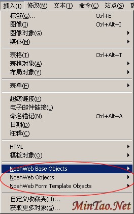 字符资源的代码可以直接在NoahWeb设计器中编辑,前提是你对文本代码的编写非常的熟悉,例如:HTML,如果不是的话还是用工具吧,这里我推荐用Dreamweaver,相信这个软件大家都很熟悉了,NoahWeb有一个专门为Dreamweaver编写表现层而开发的插件,它可以集成在Dreamweaver里面,这样可以给你写字符资源带来很大方便。如果你没有这个插件的话可以到NoahWeb官方网站去下载,下载网址:http://www.noahweb.net/download/,名字为:Dreamweaver NoahWeb扩展,当集成了扩展插件后Dreamweaver的插入栏里会多出三个NoahWeb的标签组: