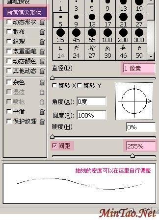 2、选择1px铅笔并按照如下设置画笔,抽线的密度可以在这里自行调整