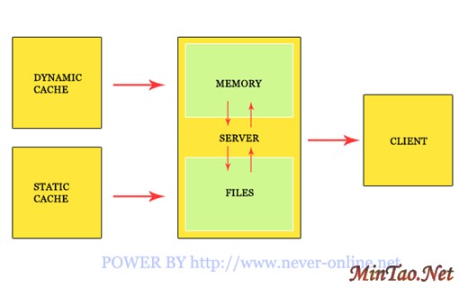 而动态的cache,我想大家都应该知道动网“迷城浪子”写的用application做为cache的class了,这是asp中比较经典的用动态cache的例子。因此我也不用说太多过于application的cache了。他的优点就在于,较静态的cache利于维护和升级。以下是静态缓存与动态缓存示意图: