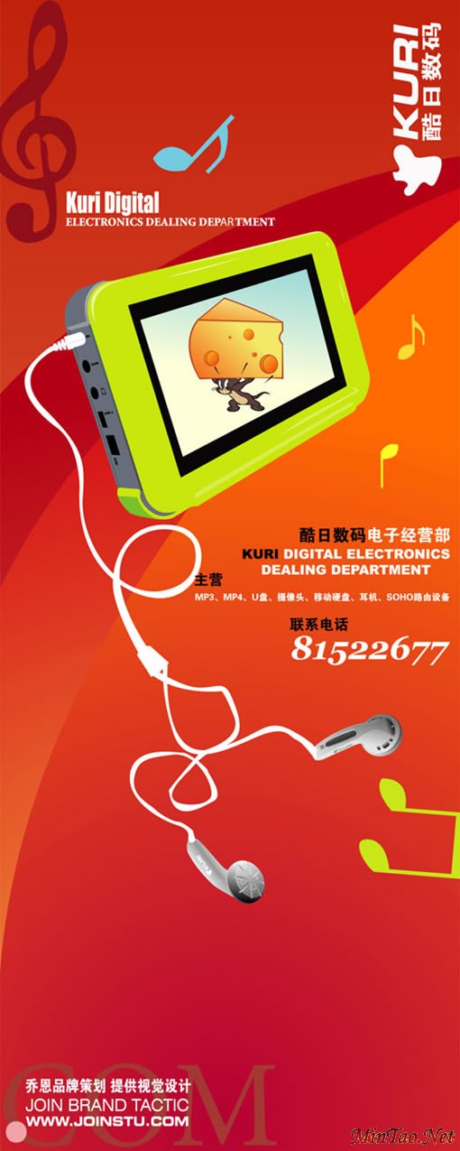 大家看这图的重点是那个MP4,但是这个对象很大,不过没关系,把这个MP4的图做得有透视性,左右的重量就不一样了。这样向左去一点,那么重心就向左去了,再加上MP4偏上,这个MP4就正好在视觉中心点上了。而主要的信息文字同样也处在视觉中心的位置上。而一些不重要的文字都放在了角度去冷落他。
