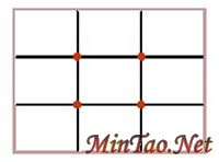 众所周知,国外有一种叫黄金分割率的概念。下面我引用一段非常专业的解释:“黄金分割最早见于古希腊和古埃及。黄金分割又称黄金率、中外比,即把一根线段分为长短不等的a、b两段,使其中长线段的比(即a+b)等于短线段b对长线段a的比,列式即为a:(a+b)=b:a,其比值为0.6180339……这种比例在造型上比较悦目,因此,0.618又被称为黄金分割率。”大家也看清楚了什么叫黄金分割。我们中国也有一种类似于这样的概念叫九宫格。这个也许就有一些朋友不清楚了,这是一种用以临写碑帖的一种界格纸。基本形是一个长方形等分九格。在这个九宫格中中间部分就产生了四个交叉点,这四个交叉点就是视觉中心点。