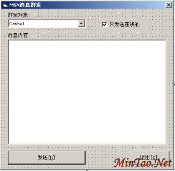 第三步:设置窗体,添加控件。首先在vb的工程管理器中双击Form1,打开窗体设计环境。选中窗体,将它的Caption值改为“MSN消息群发”。然后在窗体上添加控件,并且设置其初始属性。要添加的控件的信息见下表: 名称 类型 Caption属性的值 Label1 Label 群发对象: Combo1 ComboBox Check1 CheckBox 只发送在线的 Label2 Label 消息内容: Text1 TextBox Command1 CommandButton 发送[&O] Command2 CommandButton 退出[&X]
