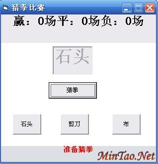 ''''剪刀'''' 电脑赢" Own = Own + 1 End If Else ''''guess="布" If playerGuess = "Rock" Then TitleLabel.Caption = "玩家出''''石头'''' 电脑出''''布'''' 电脑赢" Own = Own + 1 ElseIf playerGuess = "Forfex" Then TitleLabel.Caption = "玩家出''''剪刀'''' 电脑出''''布'''' 玩家赢" Win = Win + 1 Else ''''playerGuess="Cloth" TitleLabel.Caption = "玩家出''''布'''' 电脑出''''布'''' 双方平" Draw = Draw + 1 End If End If ResultLabel.Caption = "赢:" & Win & "场" & "平:" & Draw & "场" & "负:" & Own & "场" 同时我们统计赢,平,负的场数。 整个程序设计:程序界面设计