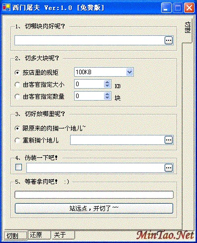 对文件进行分割、合并,并对分割后的文件可以用图片进行伪装,增加了保密性并满足了某些特殊发 布要求,因为使用了.NET框架编写,所以执行速度快,特别适合大型软件分割,如果在使用中发现任 何问题,请和我联系!