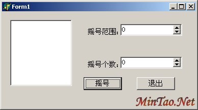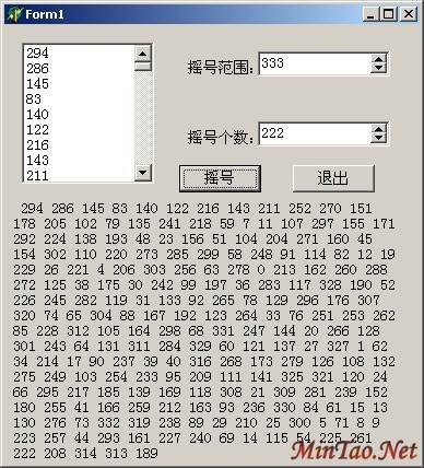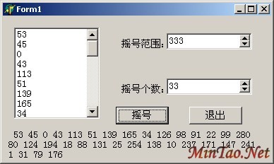 {$R *.dfm} procedure TForm1.Button1Click(Sender: TObject); var i,j,r,l:integer; s:string; All:array[0..1000] of integer;//这个数组用来装随机数的 Result:array[0..1000] of integer;//这个数组用来装结果的 begin l:=label3.Height; if spinEdit1.Value<spinEdit2.Value then begin label3.caption:=''''错了喔..倒了也!''''; label3.Width:=353; end else begin for i:=0 to spinEdit1.Value-1 do All[i]:=i; //产生M个随机数 for i:=0 to spinEdit2.Value-1 do begin j:=random(spinEdit1.Value); r:=j mod (spinEdit1.Value-1-i); Result[i]:=All[r]; All[r]:=All[spinEdit1.Value-1-i]; end; ListBox1.Clear; s:='''' ''''; for i:=0 to spinEdit2.Value-1 do begin s:=s+inttostr(Result[i])+'''' ''''; ListBox1.Items.add(inttostr(Result[i])); end; label3.caption:=s; label3.Width:=353; end; form1.Height:=(300+(l-110)); form1.InitiateAction; end; procedure TForm1.Button2Click(Sender: TObject); begin close; end; end. 运行时: