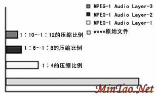 MPEG压缩格式分为3层,分别是MPEG Audio Layer-1、Layer-2和Layer-3。这其中我们最熟悉的是Layer-3,也就是常说的MP3。从上图中我们可以看出,Wave是一种没有经过压缩的音乐档案格式,不失真,但是文件的尺寸非常大,基本上存储1分钟的音乐要占用10MB的空间,所以作为随身听的源文件是不合适的。和其他两种格式相比,MP3的压缩比率更大,可以达到1∶10~1∶12的比例,而MP1和MP2分别只有1∶4和1∶6~1∶8的压缩比例。这也就决定了MP3格式的文件尺寸更加适合存储空间小的随身听使用。