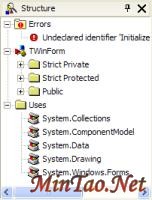 Delphi 2005 IDE左上角包含了一个结构视图. 这个窗口在某些场合特别有用. 它能显示代码编绎器中源代码的继承结构. 同样, 它也能显示HTML设计器中包含的HTML控件, 就象VCL窗体设计器显示可视化控件的继续结构一样. 对于源代码结构, 结构视图还能动态的在顶层出现一个”错误”节点显示错误实时提示窗口中找到的所有语法错误.