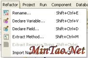 Borland Delphi 2005 带的重构支持包括许多用用的特性, 有”提取方法”到声明新的变量或字段, 到提取成资源字符串, 再到重命名标识符和复位义命名空间和uses 子句.