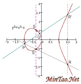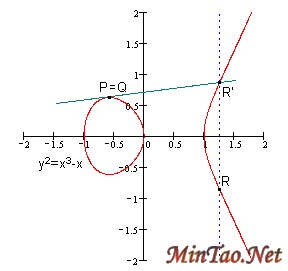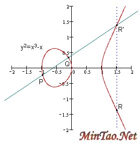 运算法则:任意取椭圆曲线上两点P、Q (若P、Q两点重合,则做P点的切线)做直线交于椭圆曲线的另一点R’,过R’做y轴的平行线交于R。我们规定P+Q=R。(如图)