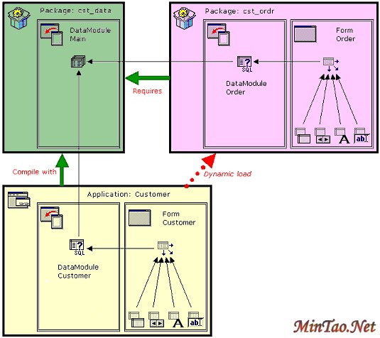 We then create a new package (cst_ordr) that will contain our customer orders form and data module and require our cst_main. We will then write code in our main application to dynamically load this package. Since the main data module is already loaded when the dynamic package gets loaded, it will use the application''''s instance of the main data module.