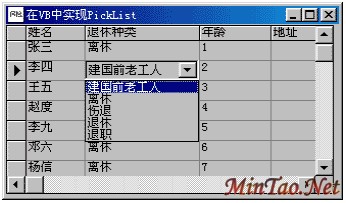 1、新建一工程,在引用中加入Microsoft Data Bound Control(即文件Dbgrid32.ocx);并把控件放入窗体中;设想记录文件包括姓名、退休种类等等,退休种类为第二列(为Dbgrid1的第一列),实现PickList功能;取DbGrid1.RowHeight=300,即与组合框的宽相等,且不允许调整Dbgrid1的行大小。