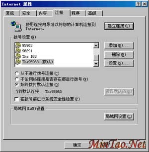 若将第一个参数(dwFlags)的值设为2,该函数无需用户干预就可自动拨号。但使用该函数有一个前提:即必须将“Internet 属性”->“连接”设成“始终拨打默认连接”(见下图)。