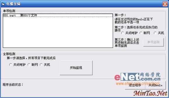 电骡(Emule)是国内最流行的P2P软件之一,他强大的功能让每位用户都能分享到互联网的优质资源。然而,主流的电骡软件中,一直没有类似于“完成任务后自动断网/关机”的选项。于是,很多朋友想尽办法让电骡下载完后自动断线、关机,却往往以失败告终。其实,我们可以写一个简单的VB程序来实现这个功能。