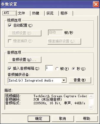 2. 参数设置 点击菜单“选项/参数设置”(如图2),我们可以看到常用的参数设置包括AVI、文件、热键、直播、程序,这里最重要的是AVI的设置,因为它关系到动画的最终效果。AVI的设置包括视频选项和音频选项两部分。视频选项的录制速度最好设为“5帧/秒”,压缩格式设为“TechSmith Screen Capture Codec”,因为这种压缩格式可以达到最大的压缩率,使完成的视频文件不至于太大。音频选项设为每隔1秒插入音频,音频设置设为PCM和22050Hz、16位立体声、86K/s,以保证声音的质量。