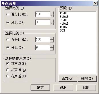 3. 调节声音素材电平大小为-6分贝左右:在主界面上选择“功率调节”选项,然后点击调节音量的按钮,在弹出的“修改音量”窗口中(如图2),增加9分贝电平,使其电平大小为-6分贝左右。