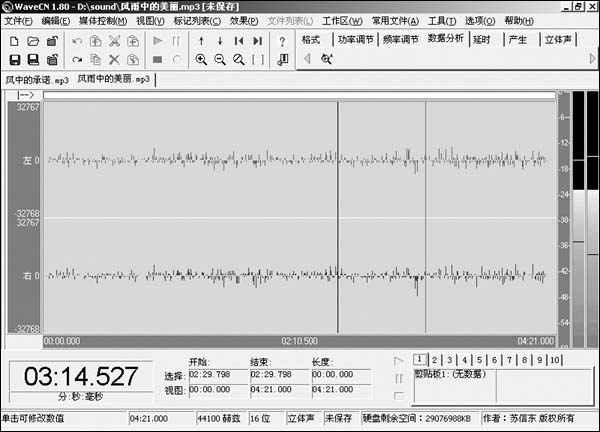 在日常教学时,我们在用电脑播放课件时,有时会遇到这样的问题:在电脑喇叭音量一样的条件下,整个课件听起来感觉声音忽高忽低。之所以这样,是因为我们在制作课件时,由于声音素材来源不同,其电平大小不一致。那么,有没有一种软件能提高、降低声音的电平,实现声音素材音量大小一致呢?WaveCN 1.80(http://gz.onlinedown.net/soft/1255.htm)可以帮我们做到这一点。 1. 打开声音素材:利用“文件”菜单打开需要调节的声音素材(风雨中的美丽.mp3)。 2. 观察声音素材中最大电平的大小:选择”风雨中的美丽.mp3“振幅最大的一段区域播放,用眼睛观察电平显示标尺,大致观察出其最大电平为-15分贝(如图1)。