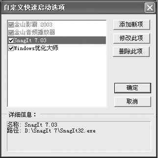 《金山影霸2003》除了通常的影音播放功能,音频、视频转换功能之外,还有其他一些“旁门左道”的应用。 1. 提取电影中的声音 如果需要影片中的某一背景音乐或一段精彩对白,金山影霸就可以将其提取为MP3或WAV格式的声音文件。运行金山影霸程序组中“常用工具”下的“视频转换器”,单击工具栏中的“转换文件”按钮;在“输出选项”中设置好输出文件的存放位置,下面的“转换成”选择MP3或WAV格式;打开一个电影文件,设置好转换的起始点和结束点。单击“开始转换”按钮,即可把电影中的声音提取到一声音文件中。 2. 定时关闭你的电脑 听着优美的音乐进入梦乡,乐曲播放完毕电脑即自动关闭,是不是很惬意?打开金山影霸程序组中“音频播放器”,单击“属性设置”按钮,在“辅助设置”下,勾选“启动辅助管理”,“辅助模式”选中“定时关闭电脑”,在“时间条件”下输入关闭电脑的时间,单击“关闭”按钮。这样,到了指定时间之后,电脑即被自动关闭。 3. 快速启动应用程序 运行“光盘伺服器”,系统托盘区出现一个光盘标志,用鼠标右击,选择“快速启动应用程序→自定义快速启动”,打开如图所示的窗口,利用“添加新项”按钮,可以添加新的快速启动程序。使用时,只需右击光盘标志,单击“快速启动应用程序”中的显示名称即可启动相应的程序。