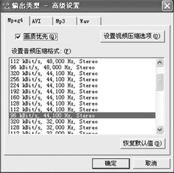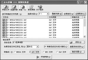 1、把光盘放入光驱,打开金山影霸视频播放窗口上的“视频转换”按钮,或点击“开始”菜单,打开金山影霸的常用工具程序组,选择“视频转换器”。 2、点击“转换VCD”选项卡,如果没有显示VCD的文件列表,点击“刷新列表”就可以显示了。 3、选择需要转换的VCD文件,默认的情况是全部选中,如果只想转换某一个文件的话,先点击“全部取消”,然后再选择要转换的文件(如图1)。 4、点击“浏览”按钮,选择转换文件的存放目录。 5、如果想在转换文件以后自动关机,就选择“转换完成关闭计算机”选项。 6、选择需要转换的格式,有MPEG4、AVI、MP3、WAV四种格式可供选择。 7、在转换格式的“高级设置”中选择文件的压缩格式,并设定压缩格式的各个参数(如图2)。 8、当以上都设定好之后,点击“开始转换”按钮,执行转换过程。