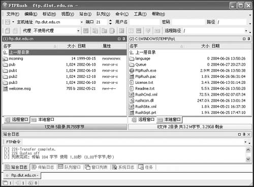 ◆基本功能 FTPRush在站点闲置保护方面表现得不错,这也是秉承了UltraFXP一贯的优势,而这恰恰正是FlashFXP的薄弱之处。在带宽有限的情况下,FTPRush还可限制上传速度及下载速度。在FTP服务器上查找文件的功能也比较强大,在搜索文件数量众多的情况上,能够实时查看搜索进度是非常实用的。此外,程序还支持显示FTP使用空间,修改文件权限及输出FTP目录树列表等。由于篇幅所限,就不一一列举了,一般FTP客户端所应具备的基本功能,FTPRush是无所不包。 ◆辅助功能 在站点管理器中,不仅可以测试收藏站点及历史站点的网址有效性,而且还可为站点管理器加密,以避免他人擅自修改站点配置。还有一个不得不提的特性就是在一个框架中,通过新建窗口来同时连接多个FTP服务器的目的,而后点击界面一端的标签即可在多个服务器间切换。 ◆内存资源占用 一般,在连接两个FTP站台的情况下,FTPRush的内存占用在14 MB多。由于程序的特性所至,连接的站台数量越多,相对于其他FTP客户端,FTPRush在资源占用上就越能体现出优势。 测试报告: