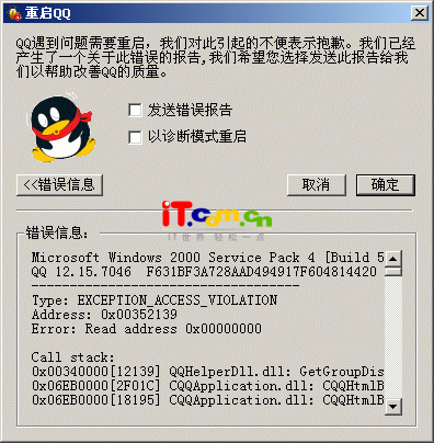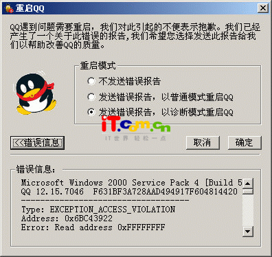 是软件总该有出错的地方,功能强大的QQ2004 Beta 也不例外,与以往不同的是QQ2004 Beta采用了专门的报告处理程序BugReport.exe,在发生错误后自动弹出让你选择采用何种方式重启QQ,这有点类似Windows 系统失败的选择,相比较早版本而言,动不动出错,一出错不断重启,一定要强制结束程序的恶况。感觉真是有点象上帝了。至于诊断模式么,似乎和系统自带的华生医生一样,在文件BugReport.smp记录主要的运行过程。