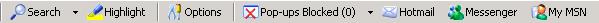 Search:查找网页内容。 Highlight:在网页检索结果中使用“Highlight”按钮来准确定位想查找的内容。这项特性能够高亮度显示检索结果的WWW页面内与检索对象一致的单词和短语。检索结果在一个被称为“Highlight Viewer”对话窗口中出现预览显示,而且不会影响画面质量。 Pop-Up Blocker:拦截弹出式广告。可控制弹出式广告的显示,通过改变设置,可以完全打开和关闭,也可能只允许显示特定WWW站点的广告。还具有记录拦截广告数量的功能。 Hotmail:查看你的Hotmail的信息,当然很方便咯。 Messenger:点击一下Messenger,就能启动你的MSN Messenger。 MSN.com:可通过单击使用MSN.com的许多服务。可以在系统中轻松使用MSN电子邮件、定制个性化的MSN内容、即时消息,MSNBC新闻等各项MSN服务。