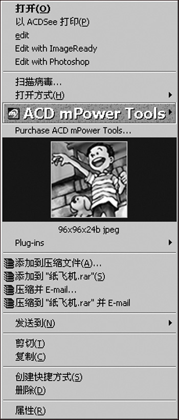 安装了ACD mPower Tools后,从程序主窗口的浏览区或Windows资源管理器中用鼠标右键单击图片文件,如图所示可以看到一个集成了缩略图的右键菜单,单击该缩略图,即可在单独的窗口中查看该图片,这与在程序窗口中直接双击图标是一样的。 二、其它实用的功能 ACD mPower Tools提供的功能虽没有ACDSee 6.0丰富,但都很实用。 ①调用Photoshop编辑图片 调用Photoshop编辑图片是ACD mPower Tools一项特色功能,在程序主窗口或者是资源管理器中选择需要编辑的图片,然后单击右键,从关联菜单中选择“Edit with Photoshop”,即可调用Photoshop打开指定的图片。 ②图片批量重命名 ACDSee中一个常用的功能就是对图片进行批量重命名,ACD mPower Tools也提供了这项功能,并且在Windows资源管理器中就可以完成。首先选择需要重命名的图片,单击右键,从“ACD mPower Tools”级联菜单中选择“Rename”,接下来的操作就与在ACDSee中批量重命名是一样的。 ③创建网页相册 使用ACD mPower Tools可以非常轻松地创建出网页相册,选择需要创建网页相册的图片后,单击“Media Tools”工具按钮,并从下拉菜单中选择“HTML Album Generator”,然后在弹出的对话框中设置好缩略图大小、网页标题以及输出文件夹等参数,点击OK确定即可。 从以上的介绍中可以看出ACD mPower Tools绝大部分操作与ACDSee是相同的,因此用过ACDSee的朋友应该能够很快上手。 下载地址:http://www.skycn.net/soft/14564.html