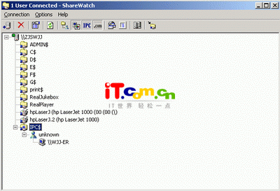 在局域网上共享文档是件非常方便的事情,有时我们在共享目录和文件的同时,很想知道是局域网上的那些用户在访问你的共享文档,可能你会不知所措。不要紧,有款小巧的软件可以帮你解决上述难题。它就是ShareWatch,正如它的名字那样“看共享”。 ShareWatch的小档案 软件版本:V1.0 软件大小:78KB 软件语言:英文 软件类别:国外软件 应用平台:Win9x/NT/2000/XP 下载地址: http://stevemiller.net/sharewatch/ 该软件下载后只有一个文件ShareWatch.exe,运行后就可以看到如图1显示的本机共享目录,还可以看到访问该目录的局域网用户。