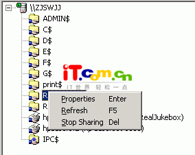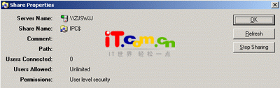 在共享目录上单击鼠标右键(图2),其中“Properties”(属性)显示图3界面,列出了本机名、共享目录名、用户连接数、允许访问权限等内容。“Refresh”(刷新)刷新本机共享目录,也可以直接按“F5”进行实时刷新。“Stop Sharing”(取消共享)取消当前目录共享的权限。