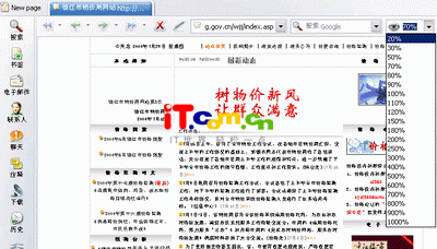 无损缩放浏览网页是Opera浏览器的一大亮点,用过IE的用户都有这样的体会,有时浏览一个网页,一行文字在一屏中显示不完,又不自动换行。这时有了网页缩放显示功能,再长的文字也让你一屏看完,点击浏览器右上角的缩放百分比(图3),网页立刻会变大变小。