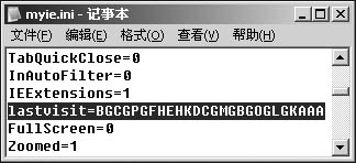 用记事本依次打开myie2config下最新保存的“.ini”文件,结果在“myie.ini”文件中的[UndoUrl]字段找到了恶意网站的链接地址,不过通过实验证明[UndoUrl]字段保存的仅是MyIE菜单“编辑→撤消关闭窗口”下的内容,与启动无关。继续查找,最后确定相关网址保存在“myie.ini”文件“lastvisit=”字段中,不过由于MyIE对其中的内容进行了加密处理,所以普通用户根本无法进行编辑,如图2所示。