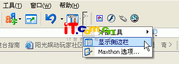 Maxthon插件的显示位置位于2个地方,一个是扩展插件栏,一个是侧边栏。侧边栏默认是不显示的,因此需要先选择工具栏上的“显示侧边栏”。按照下图进行操作。(见图2)