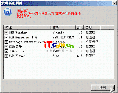 安装插件的过程很简单,在Maxthon安装目录下有一个plugin子目录,在这个plugin中建立一个文件夹,文件夹名称任意取,但是不要用中文名称。然后将下载来的插件直接解压缩到这个文件夹内。注意两点,一是直接将插件文件解压缩到新建立的文件夹中,也就是说这个文件夹中只能有插件文件,不能再有文件夹,二是每个插件分别放一个文件夹,不要将多个插件放在一个文件夹内。然后重新运行Maxthon,如果已经运行了,先退出来。程序就会出现一个提示窗口,提示已经找到插件,按“使用”按钮即可。(见图1)