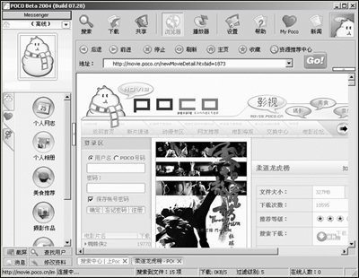 软件名称:POCO 软件版本:2004简体中文版 编辑推荐:★★★★ 下载地址:http//www.001pc.com/downloads/POCO2004.exe 随着个人宽带的接入增多,人们对新电影和各种资源表现出了强大的需求,我们面对着如此众多的P2P软件该如何去选择呢?其实分析起来很简单,它要有一个简单的下载使用环境,要有多功能多格式的下载支持,而且下载速度要足够的快,还能支持内网用户的文件传输要求,今天我们拿到了POCO的最新2004版,这个版本给我们带来了一些不错的新特性,大家不妨试用一下。 ■多种下载方式