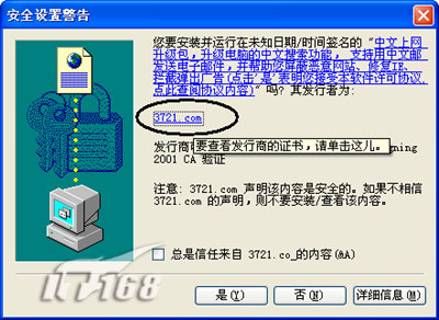 2.在Windows XP中,还可以通过设置不信任证书的方法来阻止安装网络实名的“安全设置警告”窗口的出现。当出现上述窗口时,单击其中的发行者连接: