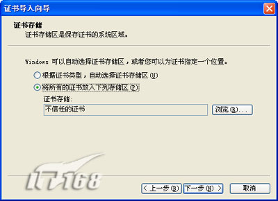 出现“证书”窗口后,单击下方的“安装证书”按钮,弹出“证书导入向导”,在“证书存储”一步中,选择“将所有证书放入下列存储区”,单击“浏览”,选择“不信任的证书”。这样网络实名就成为了不信任的证书,以后也就不会出现安装提示了。 利用这种方法同样可以阻止我们不喜欢的其它控件或插件。 如果你已经安装了3721网络实名,希望将其彻底卸载,可以利用下面的软件轻松实现: 3721的卸载程序(蓝色网际) 软件大小:81KB 软件语言:简体中文 软件评级:★★★★ 运行环境:Win9x/Me/NT/2000/XP