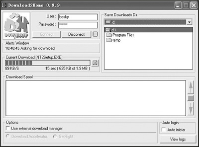 很多朋友可能都有这样的经历,单位里使用的电脑是全天候在线、光纤上网,而家里还是“小猫”上网,节假日或下班时间在家里上网时想下载一些大文件,面对奇慢无比的“猫”速就会非常烦恼了,能不能远程控制单位的机器为我们下载软件呢?Download2Home就可以满足我们的要求,只要在单位的电脑里安装好Download2Home客户端软件,家里电脑无须安装任何软件即可登录网站遥控指挥远程电脑下载软件了。 第1步:注册用户 登录Download2Home网站首页http://www.download2home.com,在页面左侧“Create user account”下方输入你的用户名和密码然后点击“Go!”按钮进行注册,如果你的用户名没被其他用户注册,网站就会提示“SUCCESSFULLY DONE, NOW YOU CAN USE D2H”,表示你已经在Download2Home网站注册成功了。 第2步:安装设置客户端软件 在网站上注册好用户后还要在单位的电脑上安装Download2Home客户端软件(下载地址:http://download2home.com/soft/download2home_0_9_9.zip),运行软件,先在左边“Save Downloads Dir”下选择设置软件下载后的存放目录,然后输入刚才在网站上注册成功的用户名和密码,然后点击“Connect”按钮即可连接到Download2Home服务器,接下来你就可以远程指挥公司的电脑进行软件下载了。 第3步:遥控指挥 在家里或其他地方上网时发现了需要下载的好软件,立即登录http://www.download2home.com,在“Send a download command”下面输入你的注册名、密码并在LINK后输入软件的下载地址,然后点击“Go!”即可给单位电脑发送下载命令了,如果反馈“DOWNLOAD SUCCESSFULLY SENT”,说明下载指令发送成功了,单位里的电脑就会开始下载你要的软件了(如图所示)。