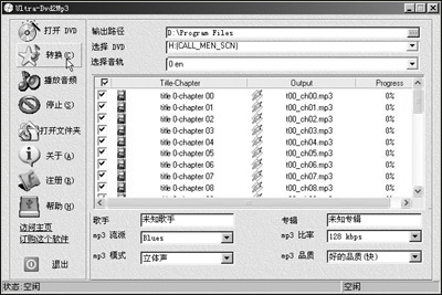 一次从朋友处借了两张DVD影碟,影片很不错,尤其是对其中的电影插曲珍爱有佳,于是想将其电影插曲保存起来,这样自己空闲时便可以反复欣赏了。可我使用的那款DVD影片播放软件偏偏没有DVD音频抓取和转换功能,于是我想到了这款非常小巧的DVD音频抓取和转换软件——Ultra Dvd2mp3(见图)。
