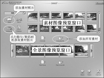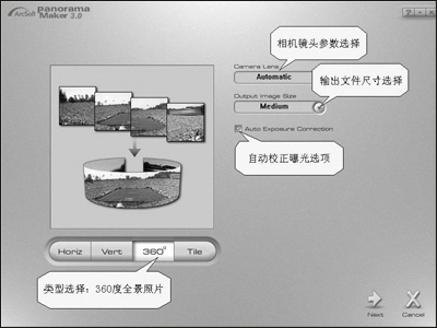 全景照片以其宽广的视角,强烈的视觉冲击,正越来越受到影友们的青睐。虽然,支持全景照片拍摄的DC种类逐渐增多,但不管你的DC多么智能,全景照片的合成最终也离不开后期处理软件。是选择Panorama Factory、MGI Photovista还是Ulead Cool 360或者PixMaker? 这里,我们为你介绍一位全能大师——ArcSoft Panorama Maker(以下简称APM),相信它一定是你不二的选择。 ArcSoft Panorama Maker 软件版本:3.0 软件大小:20.8MB 下载地址:http://www.onlinedown.net/soft/21934.htm 大师的水平到底如何?让我们一起来做一张360°的环场全景照片来考考它。 1. 素材准备 巧妇难为无米之炊,在APM中,要制作一张环场全景照片至少需要6张以上的照片素材。我为本例准备了18张的照片素材。 小知识:在拍摄全景照片素材时注意每张照片要有覆盖的部分,要沿同一方向拍摄,拍摄时的各项参数(焦距、曝光补偿等)要保持一致,为保持照片在水平范围内不会出现误差,最好使用三角架拍摄。 2. 踏上旅程 打开APM,由于它采用了向导式操作方法,使用APM3将非常容易。单击“Start”按钮踏上迷人的全景之旅。 3. 参数选择 APM3中提供了四种全景图像类型,分别是水平全景(Horiz)、垂直全景(Vert)、环场全景(360°)、矩阵全景(Tile),本例中我们选择360°(如图1)。 小知识:不同的图片素材适用于不同的全景图像制作方式。 水平全景(Horiz):适用于森林、运动场、峡谷等空间宽广的景象,拍摄一组由左至右(或由右至左)的水平连续影像。 环场全景(360°):制作360°环场影像,创造出身历其境的实景虚拟效果。 垂直全景(Vert):适用于由上而下的垂直景象,如摩天大楼、灯塔、瀑布等自然景观。 矩阵全景(Tile):适用于所有可容纳在矩形范围内的影像,如寺庙、纪念馆、雕像、壁画等,依照排列组合方式拍摄影像后,可将原景重现。 其它参数选项: 相机镜头(Camera lens):选择拍摄素材时使用的相机镜头参数,以便软件在全景合成时获得更加精密的效果,如果不知道可选默认值Automatic(自动)。