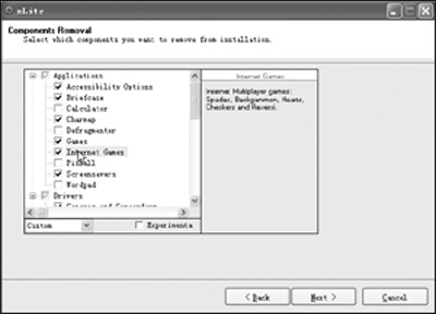 接着一直点击“Next”,当出现“Components Removal”向导窗口时,在默认情况下是“Custom”瘦身方案,如果你想采用此种方式进行瘦身,那么这时就可以在窗口左侧列表中选中不安装的项目,例如我们展开“Applications”,然后在下面列表中选中“Briefcase”(公文包)、“Charmap”(字符映射表)、“Games”(游戏)、“Internet Games”(网络游戏)以及“Screensavers”(屏幕保护程序)等项目,这将表明选中的项目不会在安装系统时安装(见图1),按照同样的方法,我们分别展开“Drives”、“Language Support”、“Directories”以及“Services”等项,然后选中不需要安装的项目。
