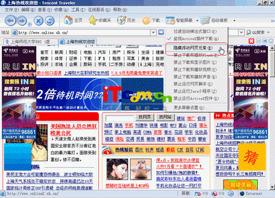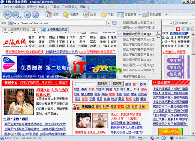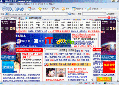 目前流行的基于IE核心的多窗口浏览器,比如Green browser和Maxthon(就是新版本的MYIE2),都集成去除广告的插件。不过比较遗憾的是,这些浏览器只能去除弹出式的广告,但是对于网页中的漂浮广告就无能为力了。新版的腾讯TT浏览器的网页去除功能非常强大,可以去除包括弹出式广告和漂浮广告在内的几乎所有网页中能见到的广告。而且设置非常简单,只要在智能屏蔽中选取“隐藏浮动网页元素”即可。下面看看上海热线的首页面窗口去除广告前和去除广告后的效果。