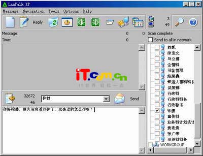 公司最近组建了局域网,这提高了办公人员的办事效率。原来必须电话传达重要会议通知,现在都改为了在OA办公网络上发送通知。不过这样也有一些弊端,那就是通知文件过多也会大量占用空间,需要经常清理磁盘空间。 今天我给大家介绍一个好软件,那就是局域网消息精灵“LANTALK XP”,它的功能最突出的优点就是,即使局域网中的其它用户没有安装软件,也可以收到你发出的消息(注:在WINDOWS2000系统和WINDOSXP系统下)。这是个功能强大的网络信使,它允许用户在网络中会话,用户能用在LANTALK XP中互通讯息,LANTALK XP使用非常简单,不需要任何学习就能开始工作。 一、安装 软件下载地址:http://www.skycn.com/soft/976.html 当前最新版本是LANTALK XP V2.8,下载完毕后,可以直接安装,在首次启动时会弹出语言选择的窗口,建议选“ENGLISH”。点确定后就会在任务栏出现一个绿色三角形的小图标。 二、基本使用方法 1、发送消息 主界面非常简洁,主要包括菜单栏、工具栏、消息显示栏、发送消息栏和用户列表五部分。如图1