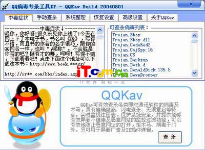 一日朋友打电话说自己的电脑在上QQ发消息的时候,老是重复发送一句话,让我帮忙看一下。笔者马上赶到朋友家,一看是中了QQ尾巴病毒,二话不说,打开XX杀毒软件的主页,下载了最新版的QQ尾巴专杀工具,可没有杀出任何病毒,这下可难倒了笔者。没有办法,打开浏览器,在里面搜索解决的办法,无意间找到了一款专杀QQ尾巴病毒的软件:QQKAV。用它很轻松的清除了朋友电脑中的QQ病毒,并且这款软件不只是可以杀QQ病毒,还可以拦截广告弹出窗口、屏蔽恶意网站等多项功能。下面就让笔者还给大家详细介绍这款软件。 QQKAV的最新版本是QQ病毒专杀工具XP 钻石版 Build 0801,下载地址为:http://www.jsing.net/soft/down.htm 一、 软件主界面