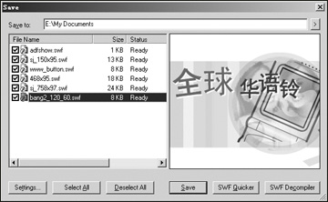 “硕思闪客精灵”可以把SWF文件转换成FLA文件,现在你只要点击“File→Export FLA”就行了,经过实际的转换测试,还原的挺好,不过笔者使用的是试用版,试用版不能导出脚本。只有注册版本才能导出脚本。 ◆轻松捕捉SWF动画 安装完“硕思闪客精灵”后,它就会自动将其图标添加到IE浏览器的工具栏上。当我们在浏览含有SWF动画的网页时,只要点击IE工具栏上的“硕思闪客精灵”的图标或者鼠标右键菜单上的“Sothink SWF Catcher”,就可轻松抓取所需的SWF动画。