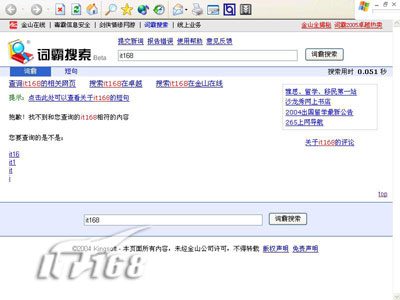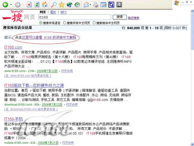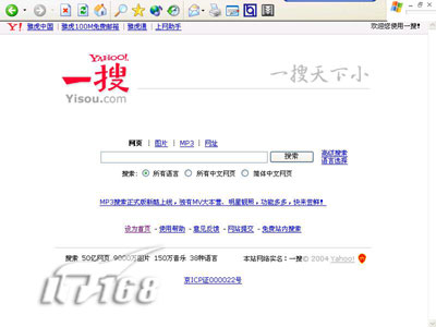 怎么样?是不是有似曾相识的感觉?看来,一搜同时吸取了Google和百度的特色功能为己所用。它不但可以进行多语言的搜索,也支持图片和mp3的搜索。下面,我们以“it168”为关键词来体验它的网页搜索功能: