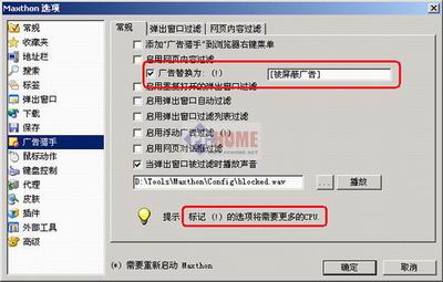 显示的语句可以在Maxthon选项的广告猎手中个性化自定义,用户如果实在厌烦了广告的骚扰,可以在这里写一些解气的话,呵呵。