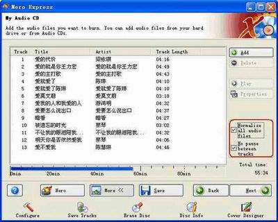 实际上绝大部分刻录软件都支持将MP3刻成CD,比如在Nero中,选择刻录Audio CD格式的光盘既可,然后选择自己喜欢的MP3文件。这里要注意的是一定要像下图那样勾选上“Normalize all audio files”、“No pause between tracks”两项,这样才能保证刻好的CD盘在车载的CD机了连续播放。(图3)
