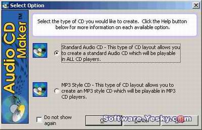 首先,连接并安装好刻录机,并将一张空白光盘放入其中;再双击桌面上的Audio CD Maker图标程序,屏幕上将自动弹出(如图4)所示的选项设置窗口,要是你选中“Standard Audio CD”选项的话,就可以制作标准的音乐CD,在缺省状态下,该选项会自动选中的;要是你想将Internet上的MP3资源,整理成一个性化的MP3专辑的话,就必须选中这里的“MP3 Style CD”,再单击“OK”按钮后,就能进入到(如图5)所示的目录列表窗口了。