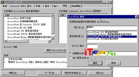 点击“开始”→“运行”,输入“dxdiag”或者依次点击“开始”→“程序”→“附件”→“系统工具”→“系统信息”,在Microsoft系统信息窗口中点击“工具”→“DirectX诊断工具”,即可打开DirectX诊断工具窗口。单击“网络”选项卡,再点击“测试DircetPlay”按钮,出现如图1所示窗口,在用户名一栏中输入自己的昵称。服务提供者选项中选择“DircetPlay8 TCP/IP 服务提供程序”,TCP/IP端口不用输入,程序会默认一个端口进行数据传输。选中“创建新会话”并输入会话名称,最后单击“确定”按钮返回。这样一来,你的“聊天室”就组建好了,把你的IP地址告诉局域网里的其他用户,他们就可以加入到你创建的会话中了。